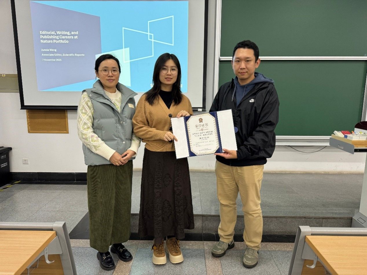 王军霞博士首先介绍了自身研究方向及作为期刊学术编辑的工作内容,随后详细介绍了Springer Nature 简介、Scientific Reports 概况以及科学出版的关键环节,与师生分享了如何撰写高质量学术论文的实用指南。最后,王博士介绍了期刊编辑职业发展路径,为广大学生带来了职业发展新视角。报告结束后现场师生就学术出版、AI与科研伦理、个人职业发展等问题与王博士进行了热烈的讨论。