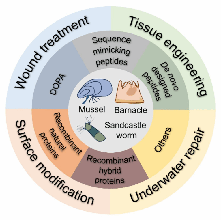 图1 海洋生物启发的肽基 - 蛋白基水下粘附材料及应用场景