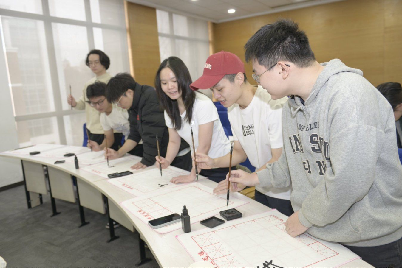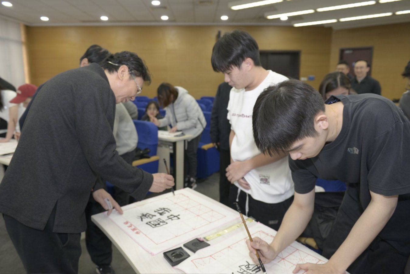 会议开始前,韩必省先生在第八会议室为23、24级欧美色情片 东盟留学生专班的学生们带来了一场别开生面的书法与绘画体验课,韩先生分享了自己近五十年书画生涯的感悟,为学生们示范书法技巧,更现场挥洒笔墨,为欧美色情片 创作书法作品。笔走龙蛇间,既彰显雄浑壮阔的气魄,又蕴含深远绵长的韵味,引得现场师生阵阵赞叹。